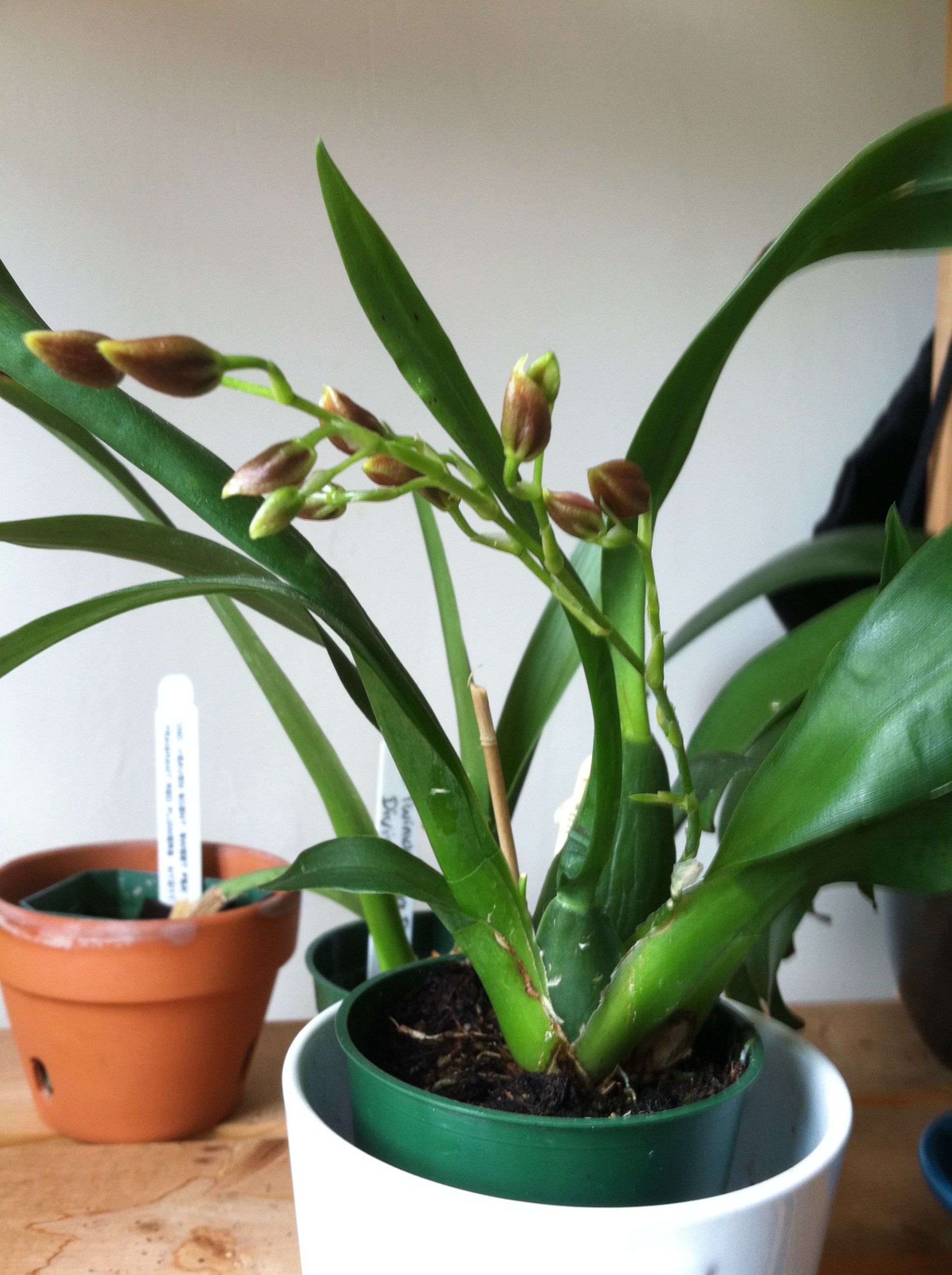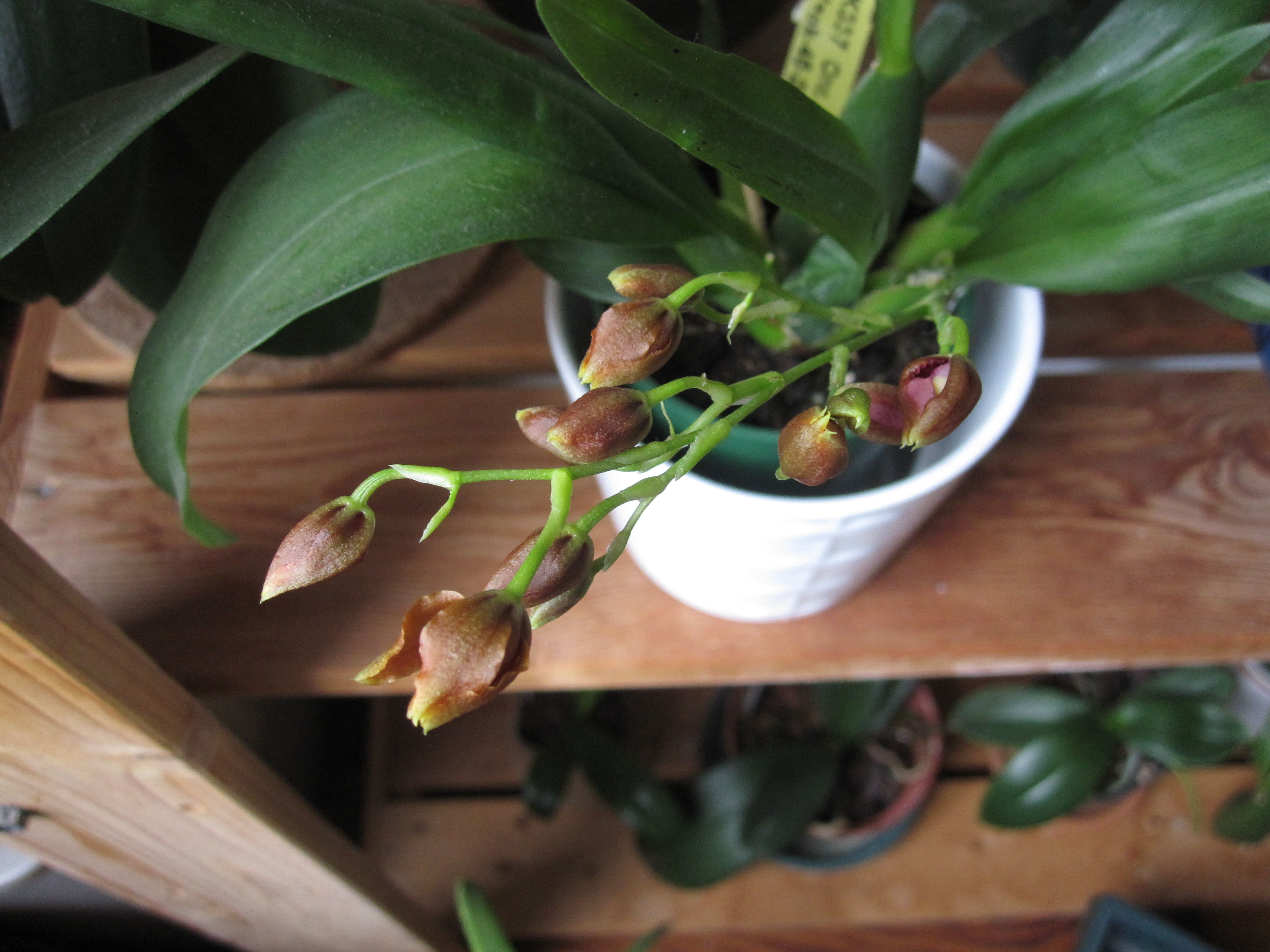 These blooms are a tad fragrant at night, but not so much during the day. They’re about three or four times the size of Oncidium Twinkle Fragrance Fantasy blooms and the color reminds me a bit of an Oncidium Sharry Baby. Here’s how this plant compares in size to a couple of my Phals that are currently in bloom: