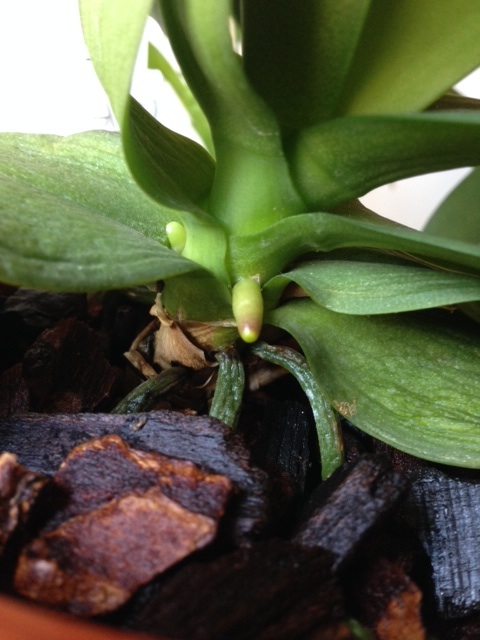 Because these orchids each have a new root and a new spike coming out, these photos are excellent examples of how to tell the difference between a root and a spike, as I’ve posted about in the past. You can very clearly see that the roots have rounded tips and the spikes have that flattened mitten-like shape. (It’s easier to see in the first image.)