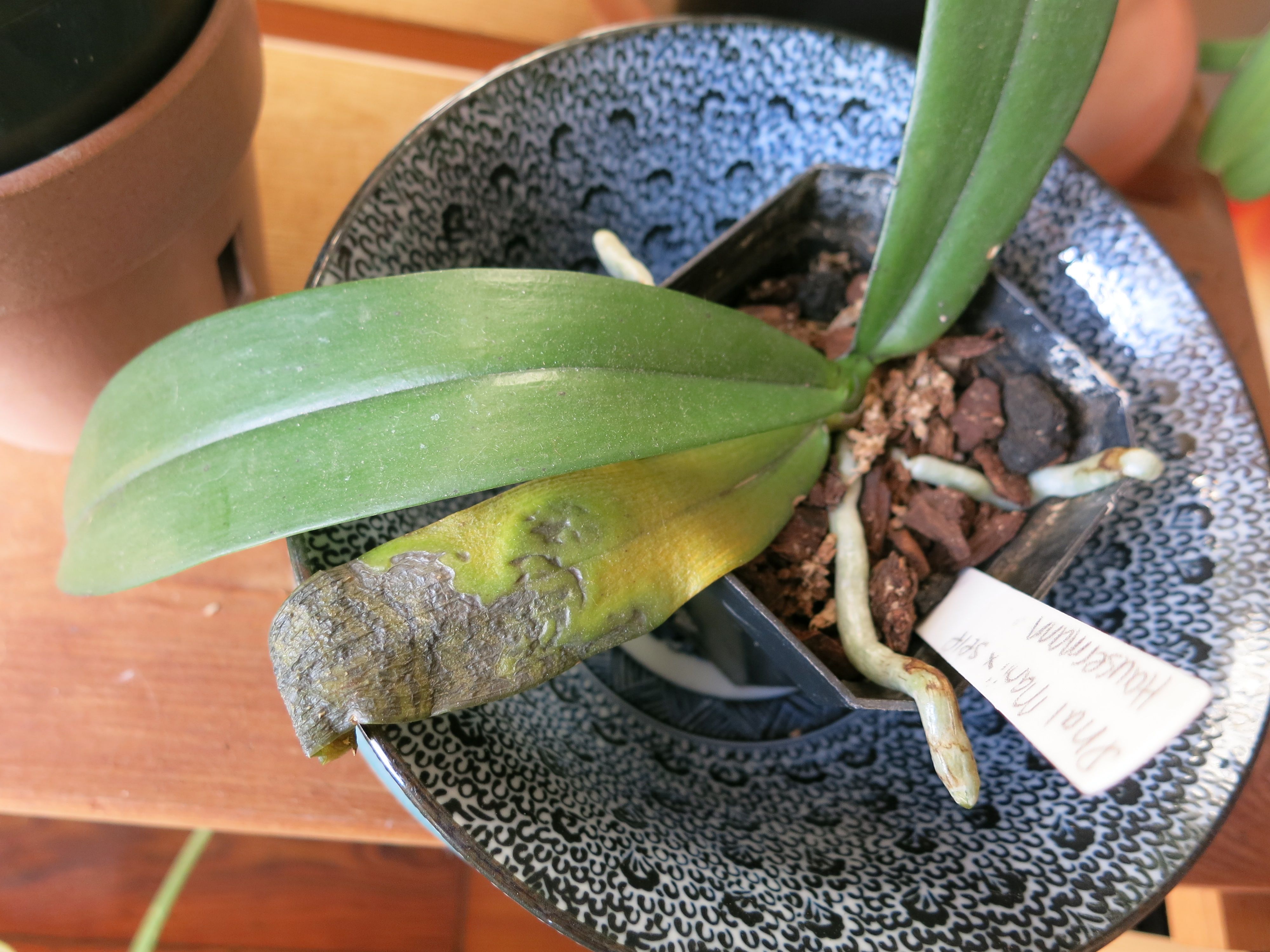 On another note, one of my Phals has a dying leaf that looks like it could be the result of a virus or something (pic below)…any readers out there have any idea what the issue might be?