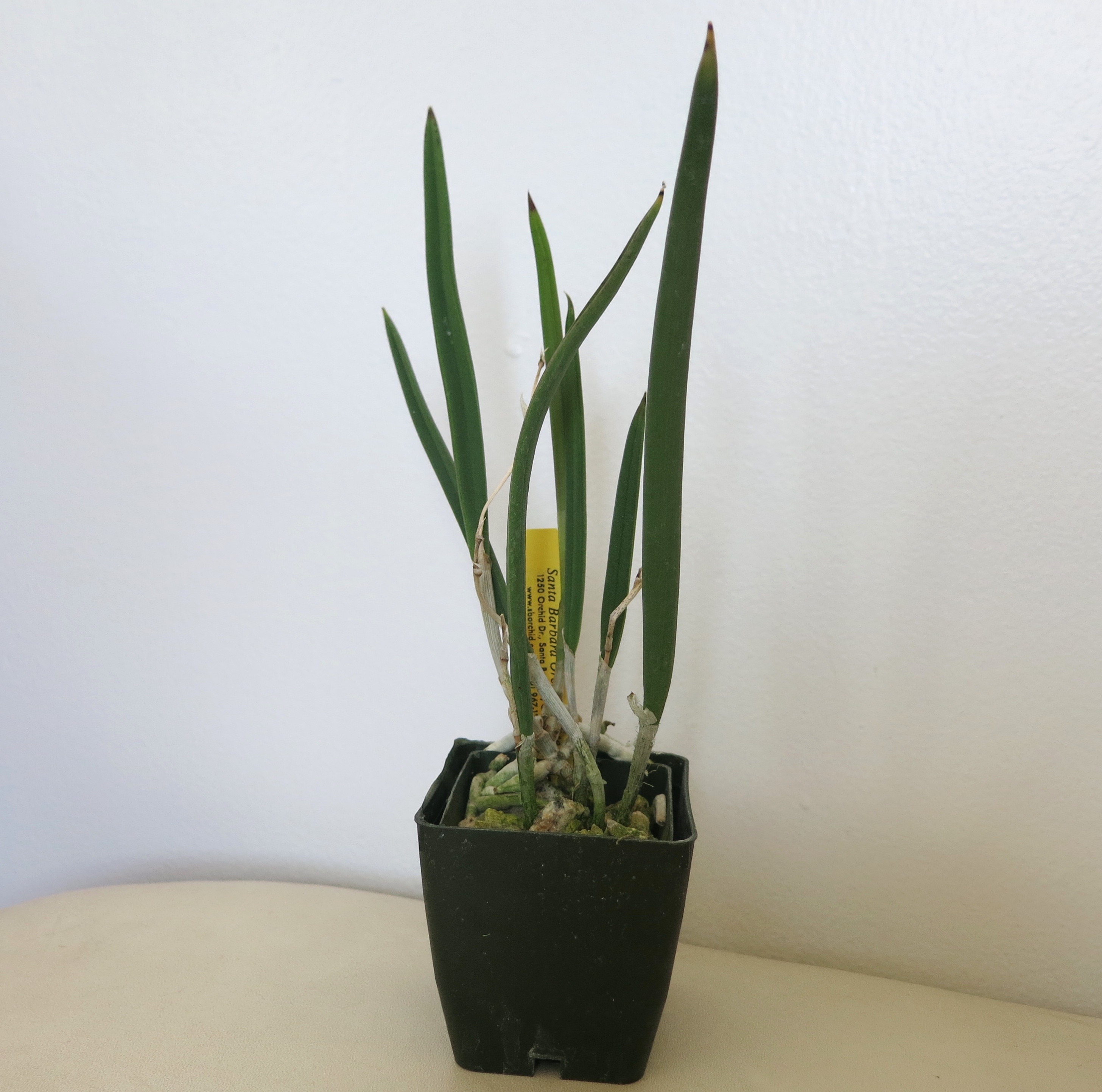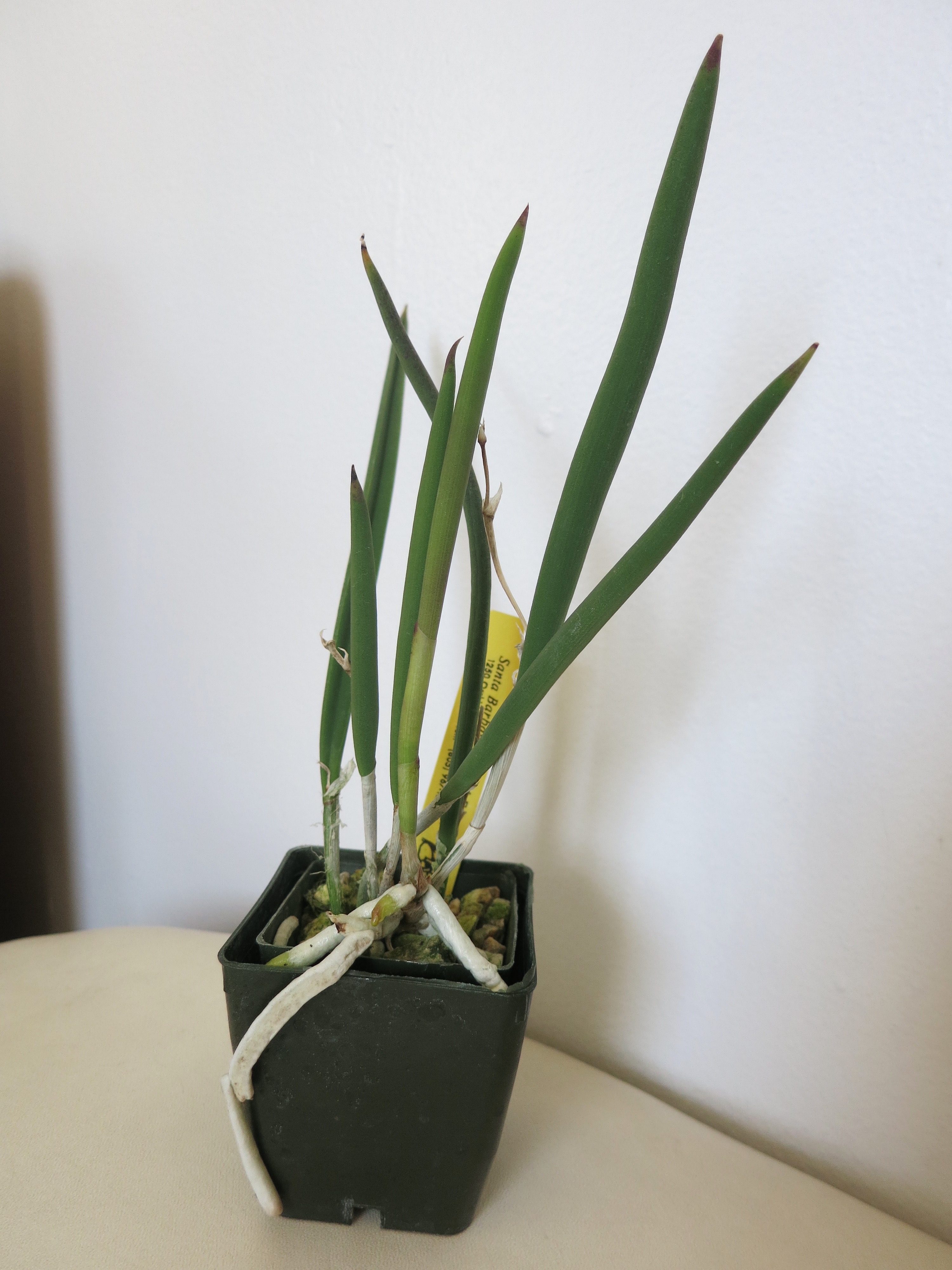 And speaking of new orchids, I got a fourth orchid from Santa Barbara Orchid Estate as a birthday gift from my husband! When I placed my order with them using my gift certificate I thought I was getting four orchids, but they only sent three because that’s all the certificate covered once shipping was factored in. However, they didn’t communicate to me that they were only sending three, and they left the Brassavola nodosa off my order. That orchid was actually my first choice, and had I known they weren’t sending it I would have asked them to send it and take one of the others off the order instead. Anyway, long story short, they apologized for the confusion and offered to send me the Brassavola and cover the shipping cost if I was still willing to purchase it. My husband kindly offered to buy it as a birthday present, so I’m now the proud new owner of a Brassavola nodosa!
