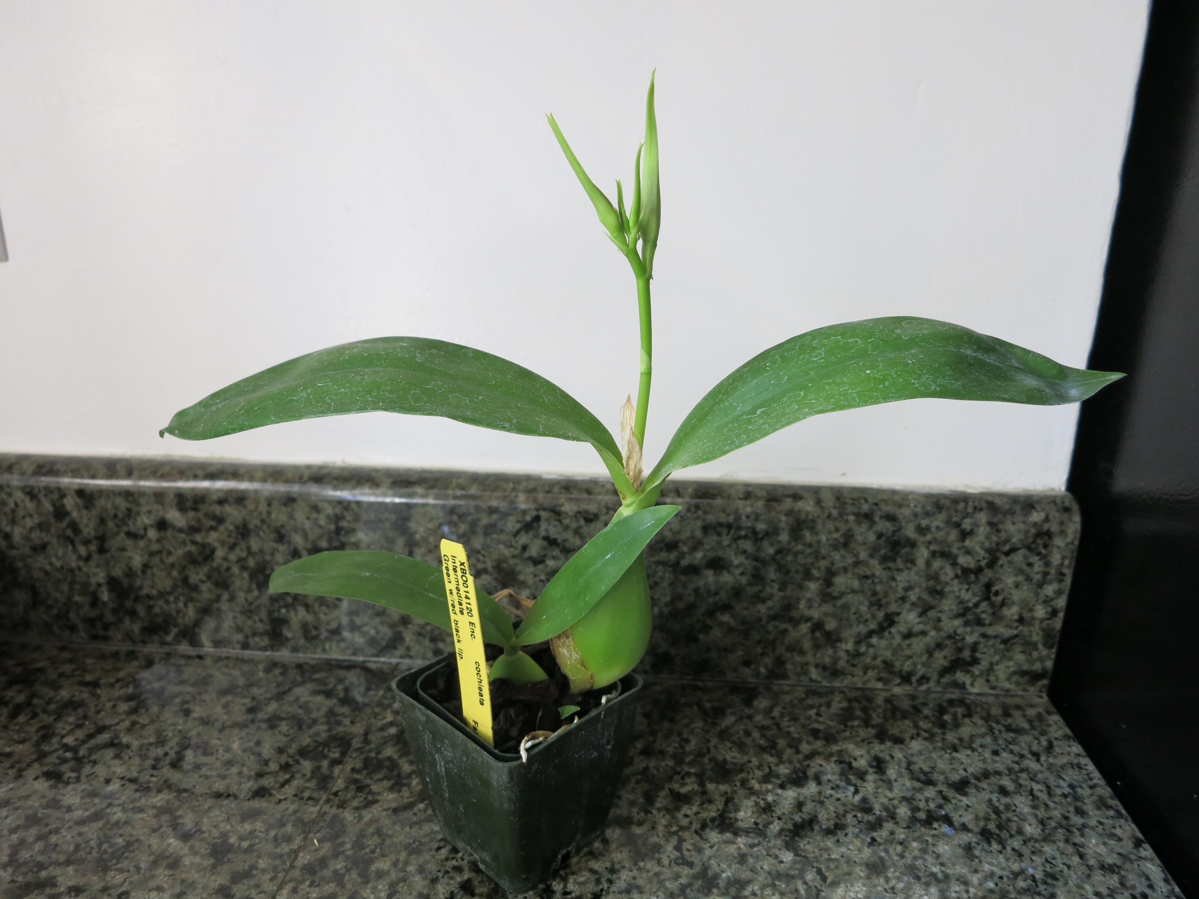This morning it became clear that what I had thought were multiple spikes poking out from the top of my Encyclia cochleata are actually flower buds: