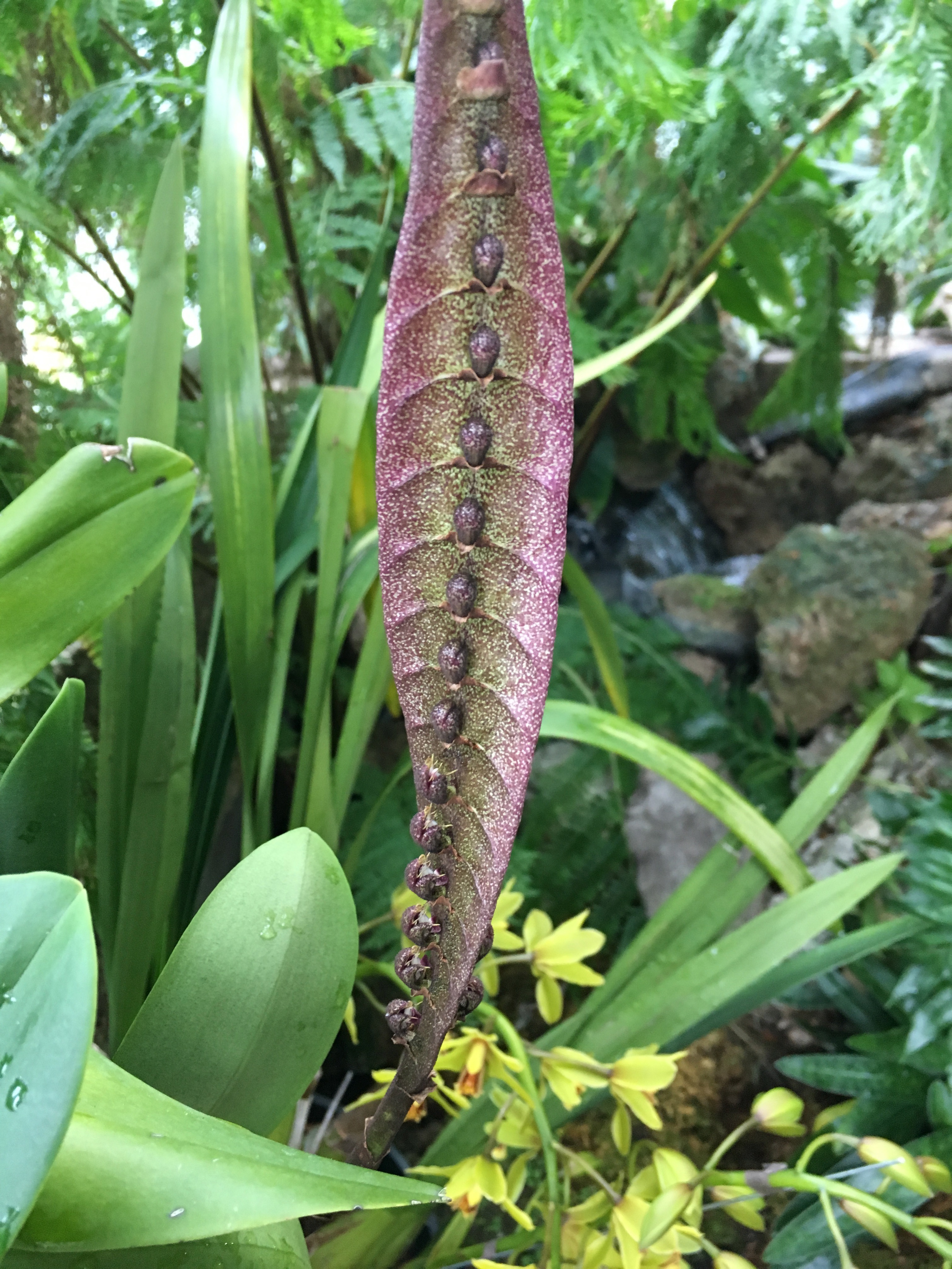 This next orchid is rare and is certainly the most unusual one that I saw during my visit. That big, flat mottled purple thing is called a rachis, and the blobs in the middle are the buds and blooms! The buds at the top were closed, but the ones down near the bottom were open. They look like beetles crawling up a fat purple leaf. This thing seems almost alien. SO COOL!