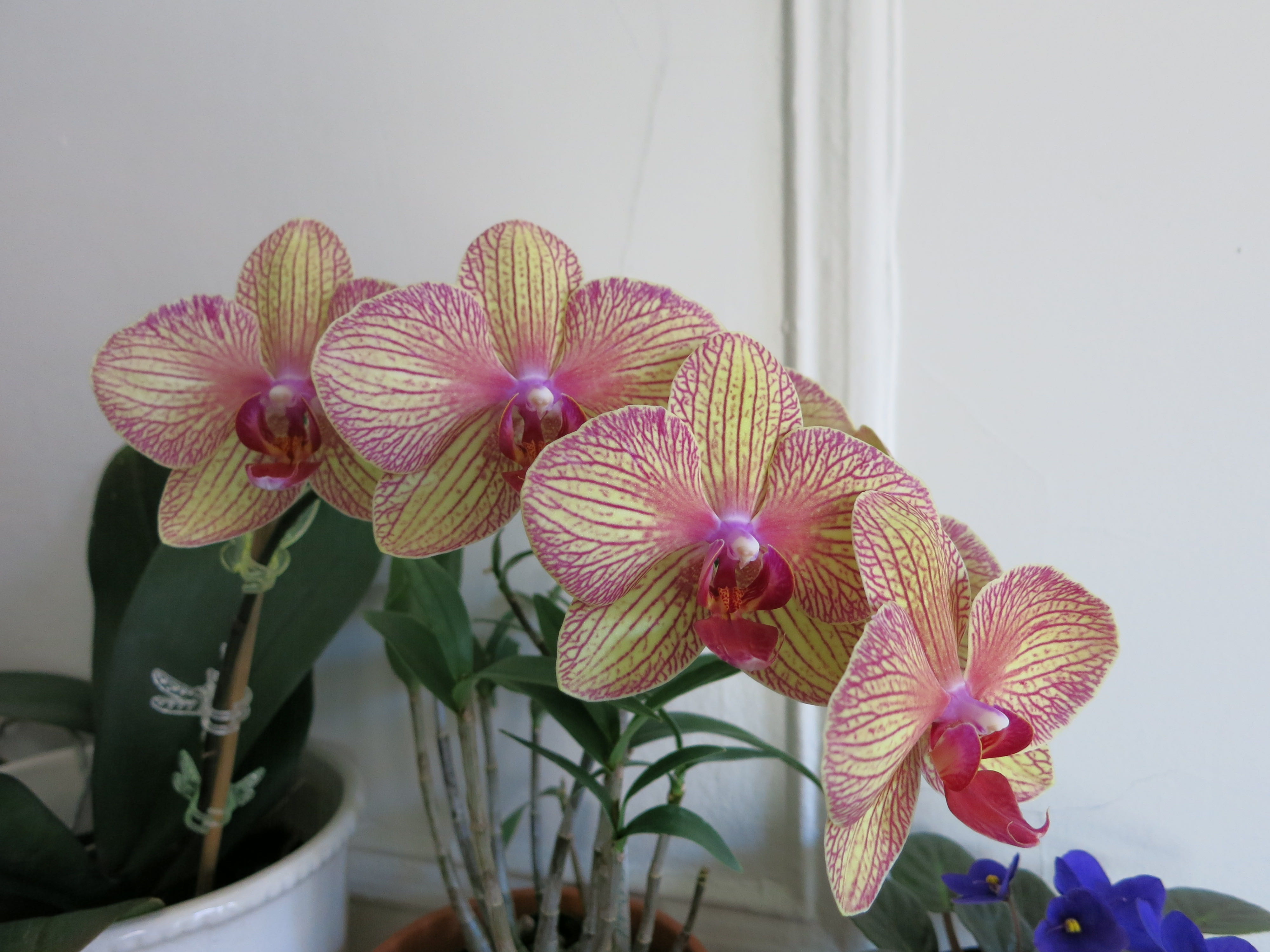Fall isn’t traditionally the time of year for new plant growth; fall is the season in which the leaves on many outdoor plants start to turn all manner of fiery colors and drop off. On the other hand, certain types of household orchids, such as the ever-popular Phalaenopsis, often begin to put out spikes in the fall that lead to spectacular blooms in the winter and spring. When left to grown on its own, an orchid spike can become heavy with blooms that droop down over the side of the pot, so I highly recommend staking your orchid’s spike to secure it and to make for a lovely cascading spray of flowers like so:FL_phals