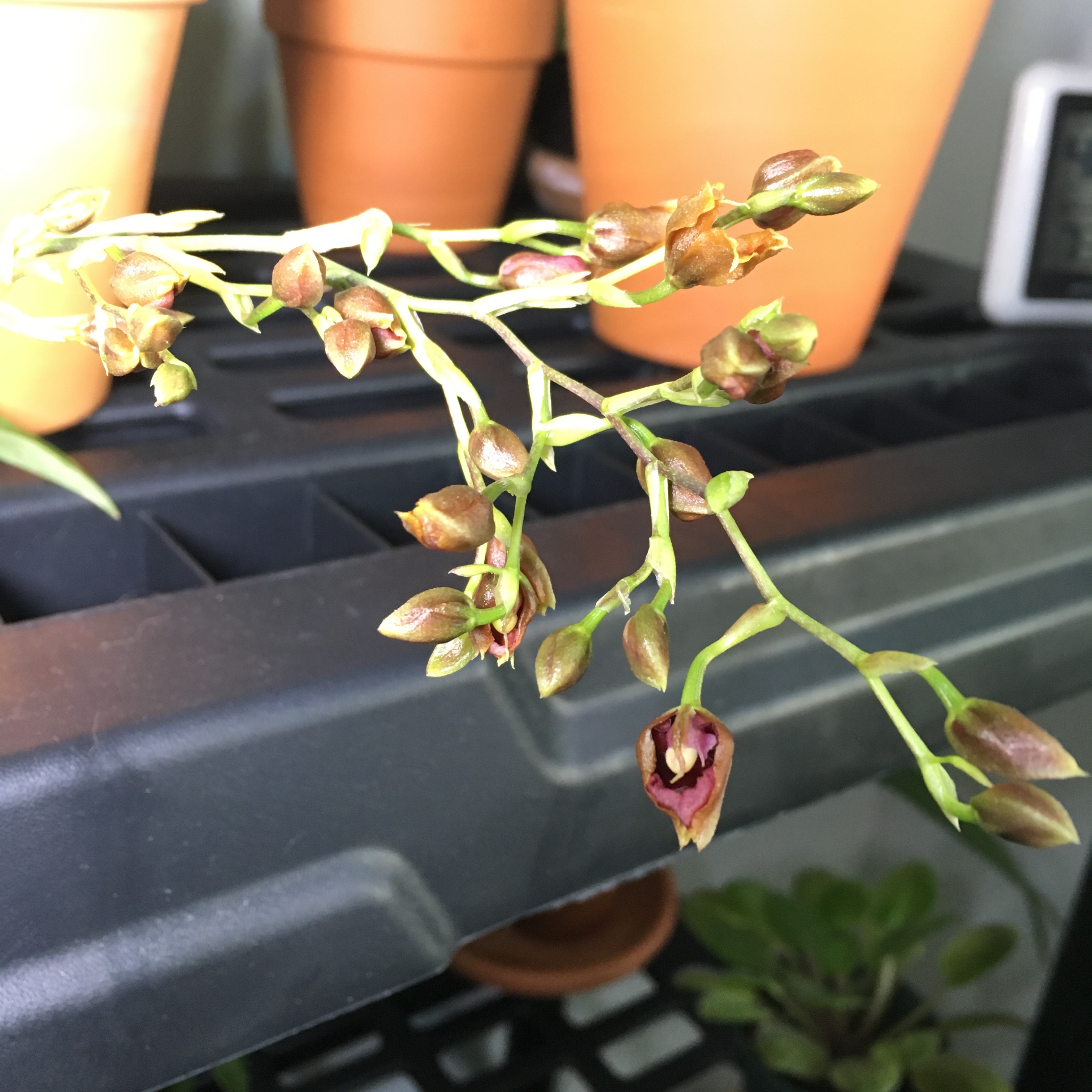 I was hoping that my NOID Oncidium blooms would start to open up on my birthday (June 13) as they did the last time the plant bloomed two years ago. Well, that didn’t happen, but they did begin to open up the morning after…so, close enough! Compare what the buds looked like yesterday morning…